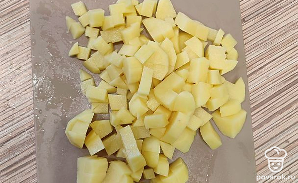 Пока готовится бульон, очистить картофель. Промыть и нарезать небольшими кубиками.