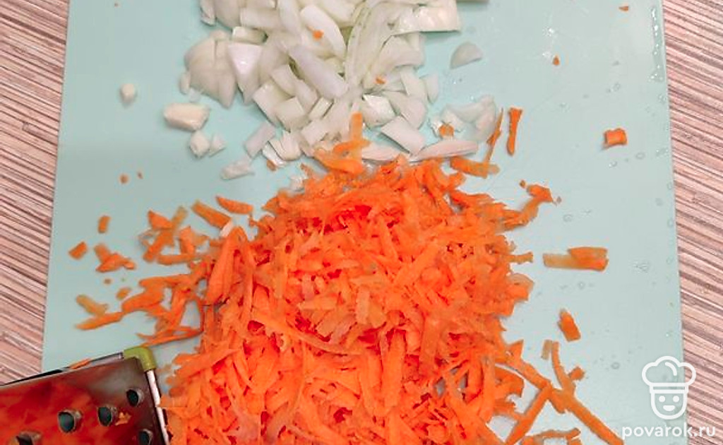 Приготовить поджарку. Репчатый лук, морковь очистить, промыть. Лук мелко нарезать, морковь натереть на крупной терке.
