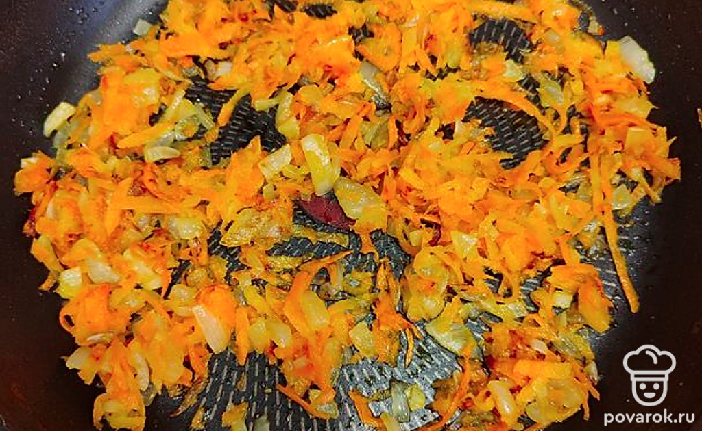 Обжарить лук, морковь на растительном масле до золотистого цвета.