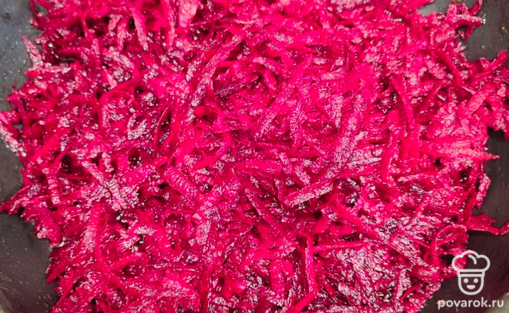Свежую свеклу очистить, помыть и натереть на крупной терке. Выложить на сковороду. Налить 1 стакан воды и варить под крышкой, пока свекла не размягчится. Добавить 1 столовую ложку уксуса. Перемешать.