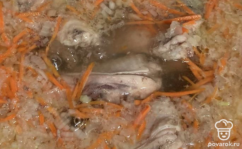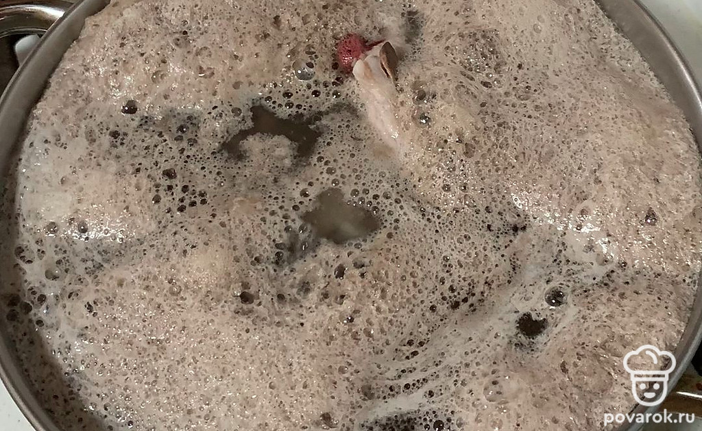 Пенку снимаем вовремя и тщательно. Это важно, чтобы бульон был прозрачный. Даем закипеть. Солим и снова хорошенечко собираем пенку. Убавляем огонь и прикрываем крышкой, пусть варится.