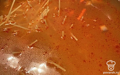 В кастрюлю с кипящей водой положите овощи, предварительно пассерованные 10 минут на оливковом масле со спагетти. Посолите по вкусу.