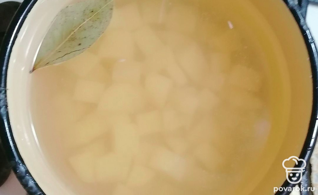 Картошку нарежьте некрупными кусочками. Поставьте вариться вместе с лавровым листом.