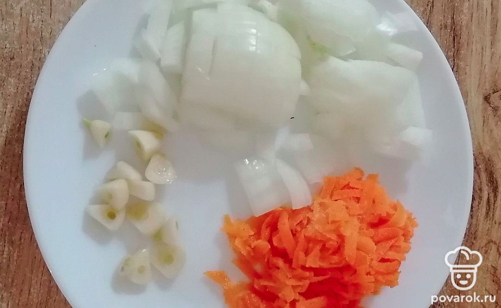 Лук и чеснок нарежьте кубиками, морковь натрите на крупной терке.