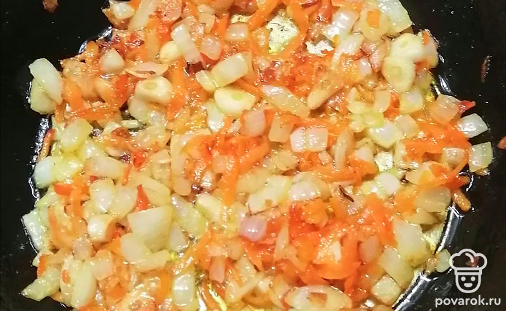 Обжарьте овощи на растительном масле на сковороде до золотистого цвета.
