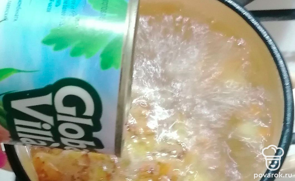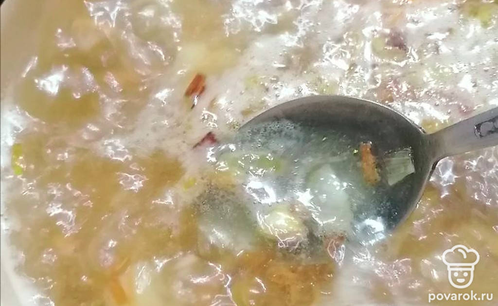 Когда картошка закипит, снимите пену и дайте покипеть 5 минут. Добавьте обжаренные овощи.