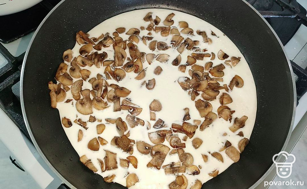 Грибы посолите, поперчите и влейте к ним сливки. Тушите пару минут.