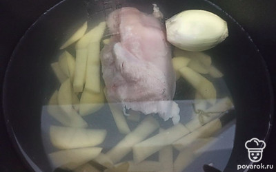 Картофель для супа нарежьте ломтиками, а лук добавьте целиком, посолите по вкусу.