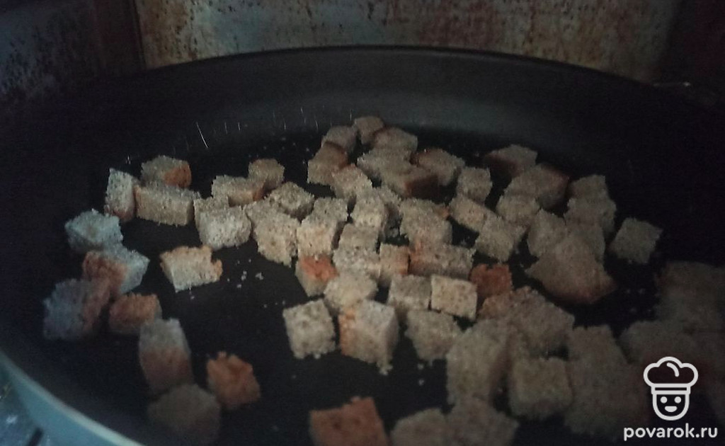 Хлеб нарежьте мелкими кубиками. Запеките в духовке в течение 10 минут при 200 градусах.