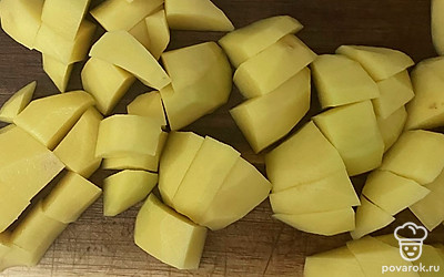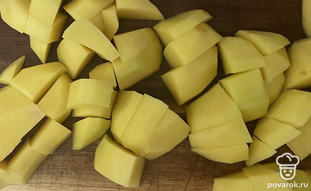 Картофель нарежьте кубиком или брусочками. Опустите картошку в бульон и варите 10 минут.