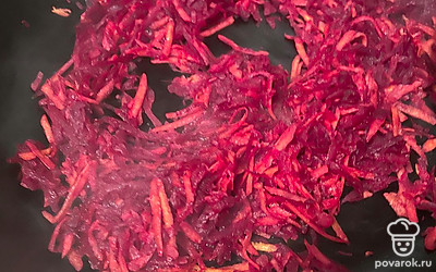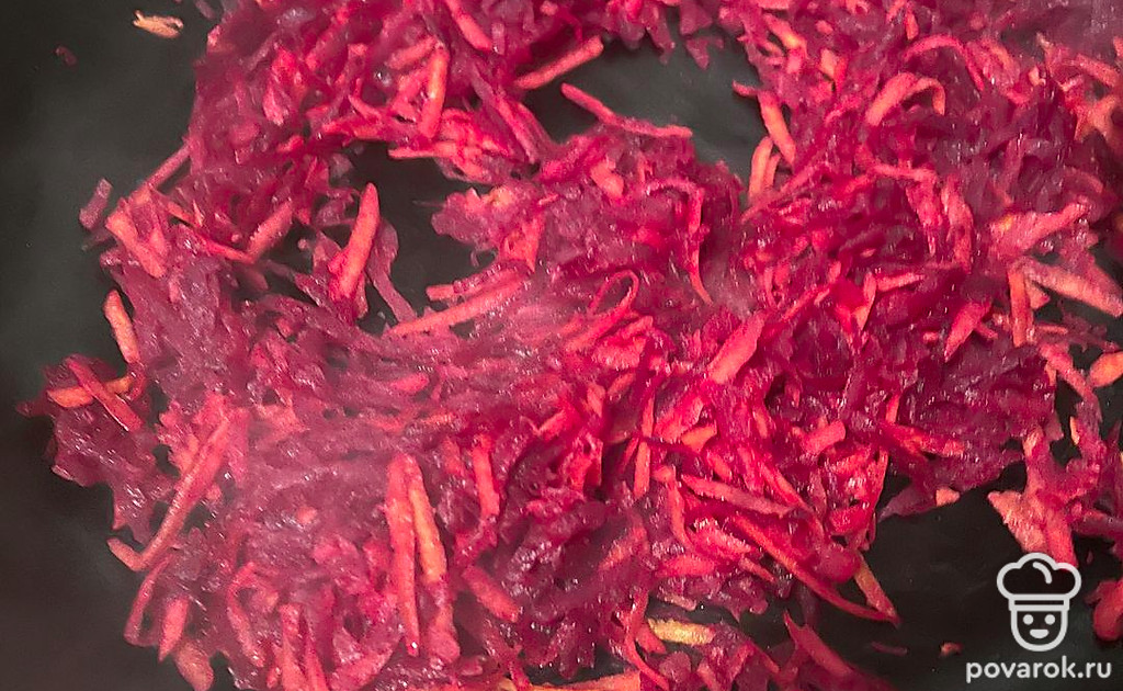 Пока варится картофель, приготовьте зажарку. Свеклу и морковь натрите на терке. Обжарьте овощи на подсолнечном масле несколько минут.