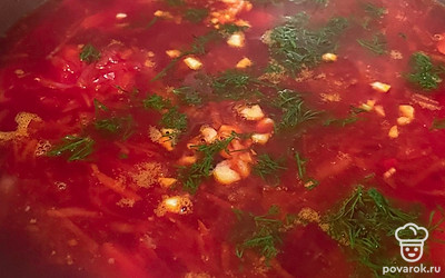 Капусту измельчите и добавьте в борщ, проварите 5 минут. Выложите в борщ зажарку из моркови и свеклы.
