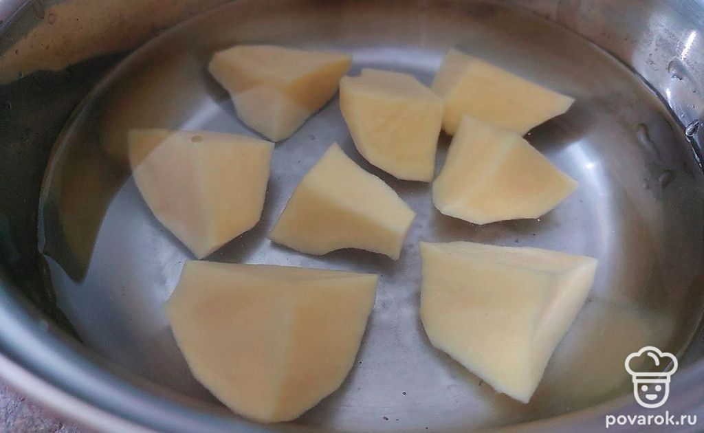 Картошку помойте и очистите. Для того, чтобы сократить время варки, нарежьте картошку на небольшие части. Залейте водой. На одну порцию достаточно 500-700 миллилитров и варите до готовности.