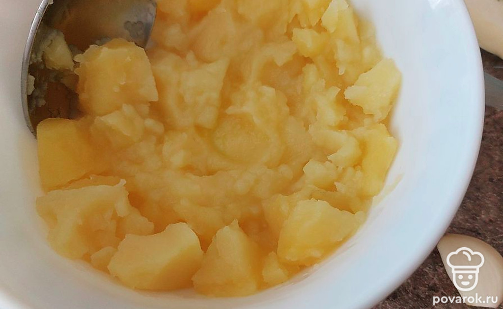 После того, как картофель сварился, выложите его на тарелку. Ложкой разомните, но не полностью.