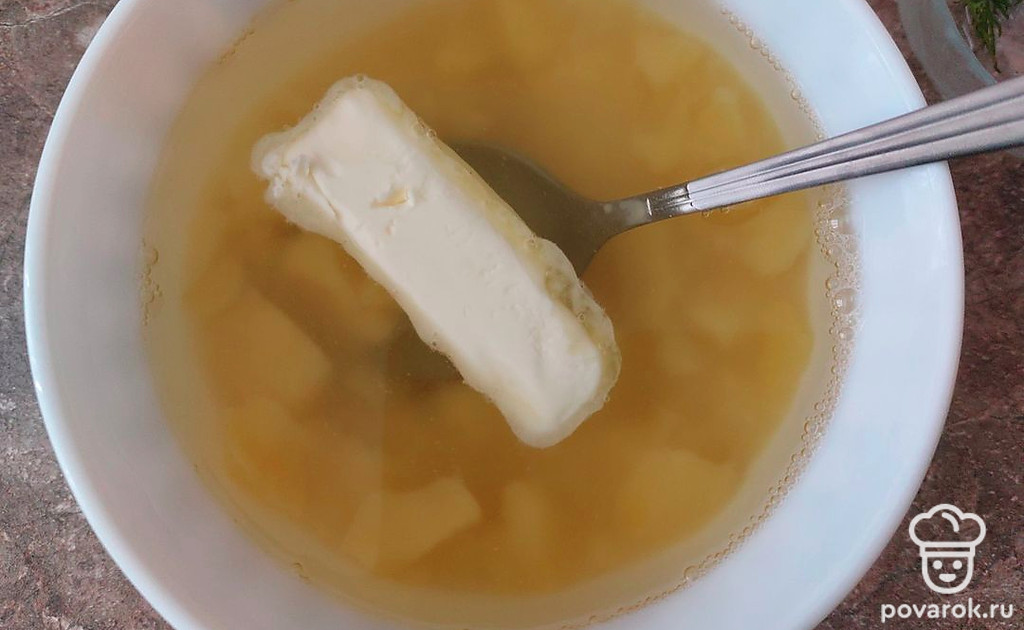 Залейте получившееся водой, в которой варился картофель. Добавьте сливочное масло.