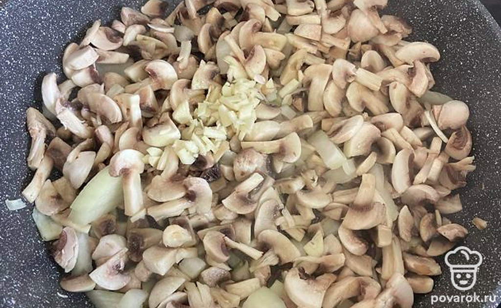 Очистите, измельчите чеснок. Добавьте к грибам. Обжарьте на среднем огне, помешивая, до готовности.