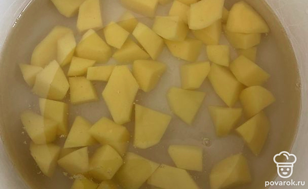 Очистите и нарежьте картофель. Залейте водой в кастрюле, поставьте вариться. Томите, помешивая, до готовности картошки.