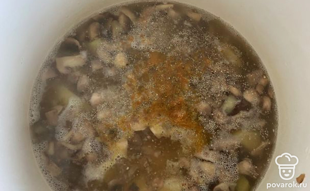 К картофелю добавьте зажарку из грибов. Приправьте специями. Варите 5 минут