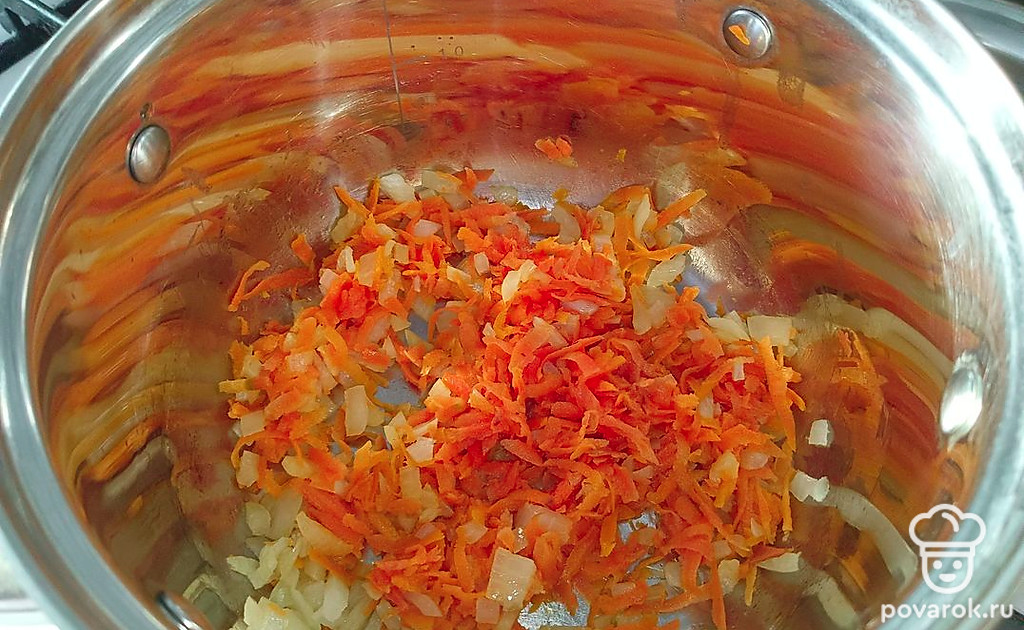 Обжарьте лук с морковью на подсолнечном масле в течение 3-4 минут.