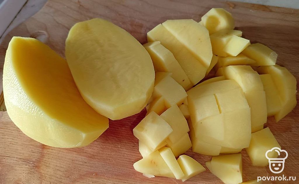 Налейте в кастрюлю воду, доведите до кипения и добавьте картофель. Посолите, поперчите и добавьте базилик по вкусу.
