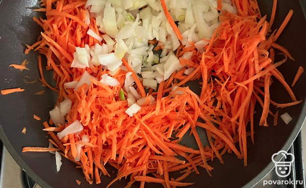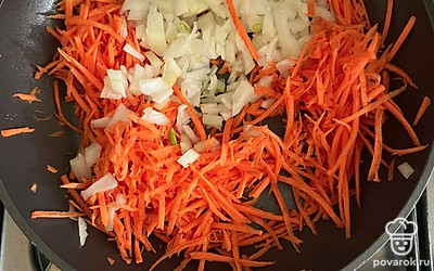 Пока фрикадельки варятся, морковь натрите на терке, лук мелко нарежьте. На разогретую сковородку налейте немного масла. Выложите лук и морковь, жарьте 5 минут.