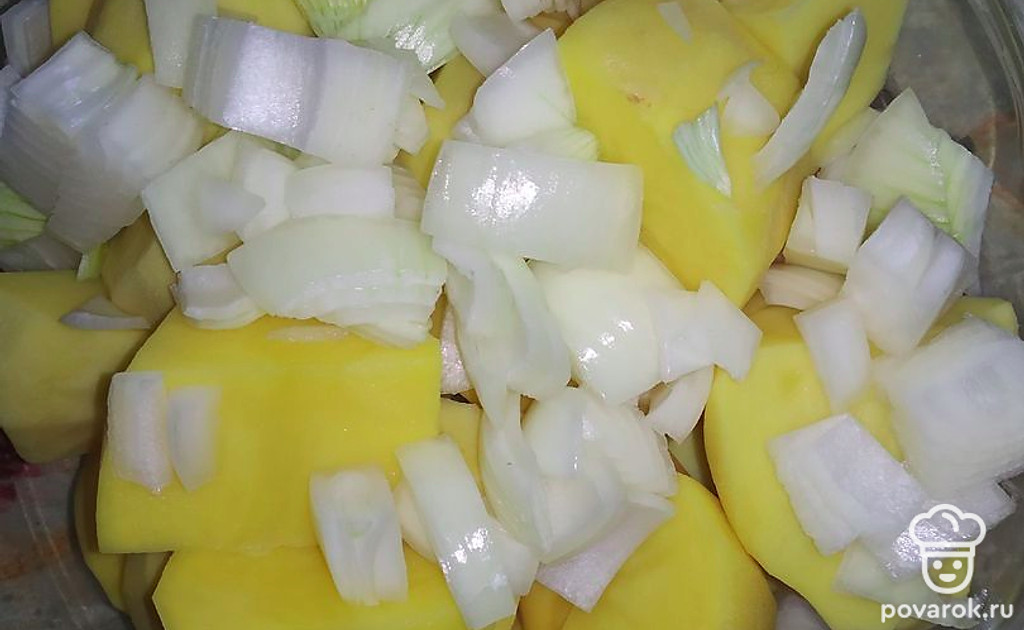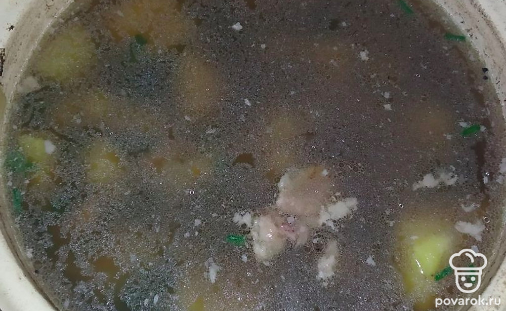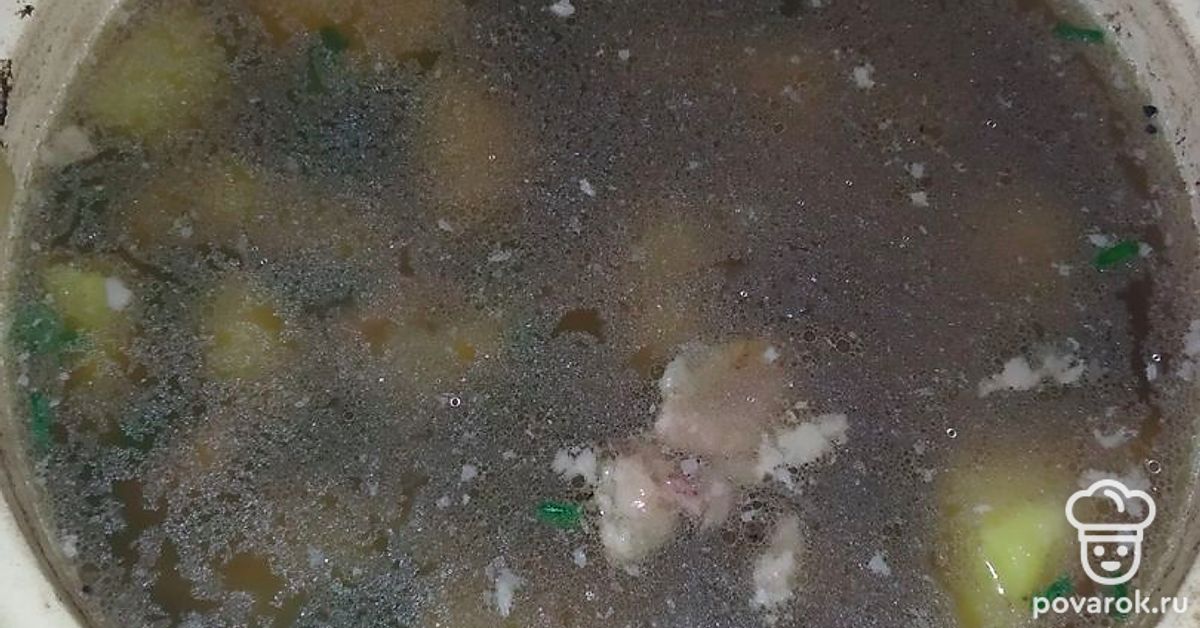 Картошку помойте, почистите, крупно нарежьте. Лук почистите, нарежьте кубиками. Овощи отправьте в суп через 30 минут после закипания бульона. Когда суп сварится, достаньте косточку, удалите с нее мясо. Мясо отправьте в суп, перемешайте. Косточку можно выкинуть.