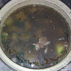 В кастрюлю налейте воду, поставьте на медленный огонь, добавьте косточку, соль, перец и лавровый лист.
