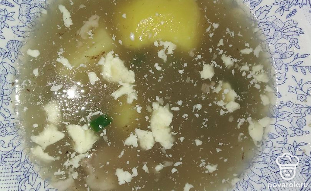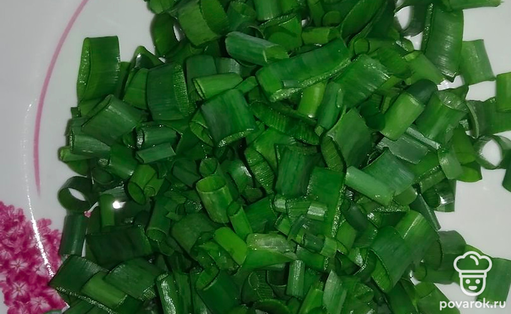 Зеленый лук помойте, мелко нарежьте. Добавьте лук в готовый суп, перемешайте.
