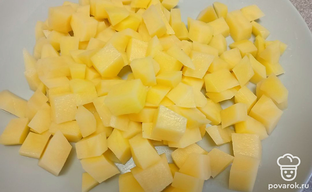 Картофель нарежьте небольшими кубиками, добавьте в утиный бульон, варите 5 минут.