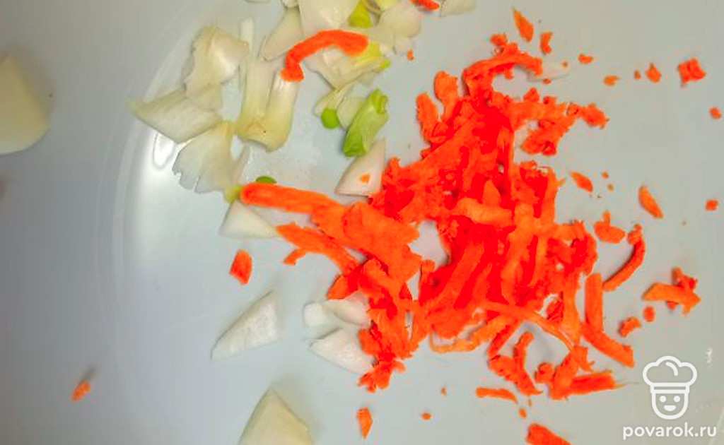 Добавьте нарезанный репчатый лук, немного зеленого лука и натертую на крупной терке морковь.