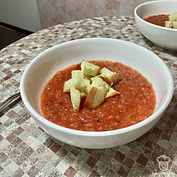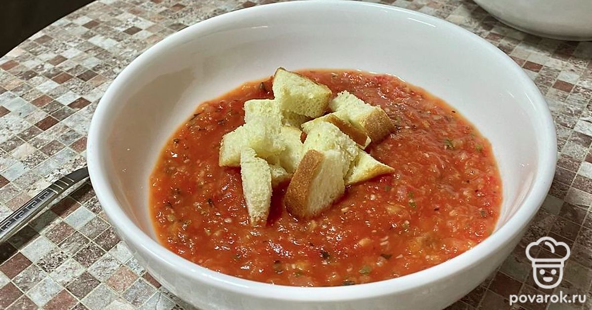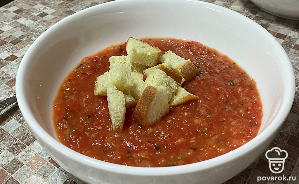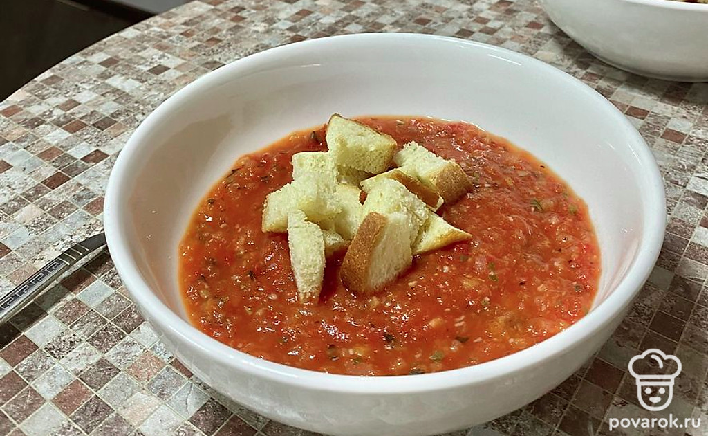 Суп налейте в тарелки, посыпьте сухариками. При желании, блюдо можно украсить любой зеленью. Томатный суп готов!