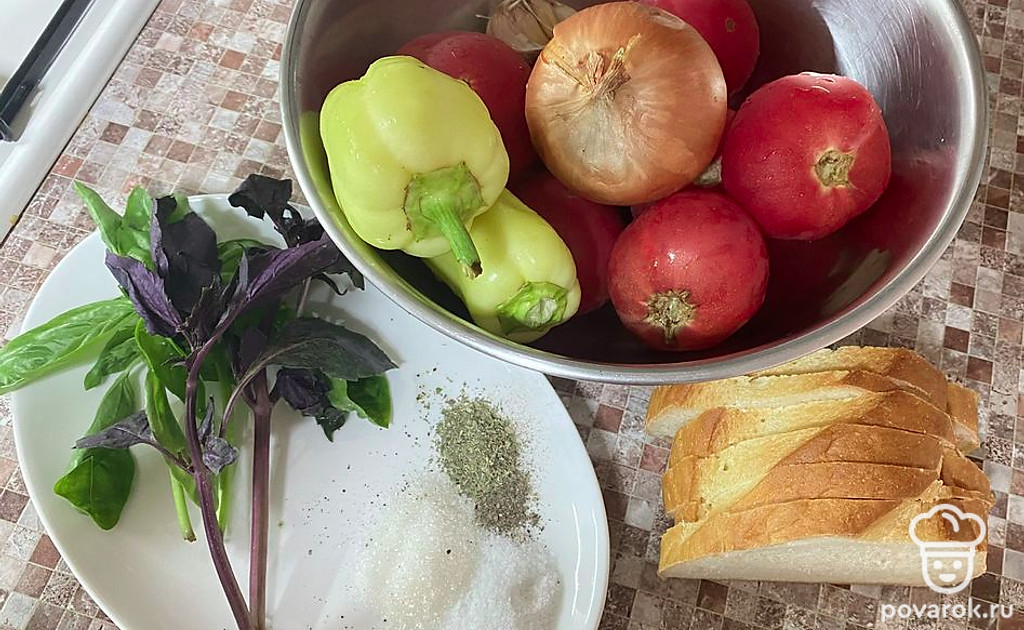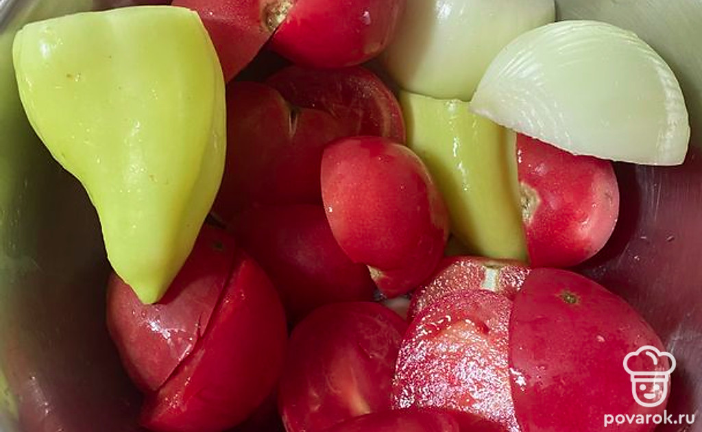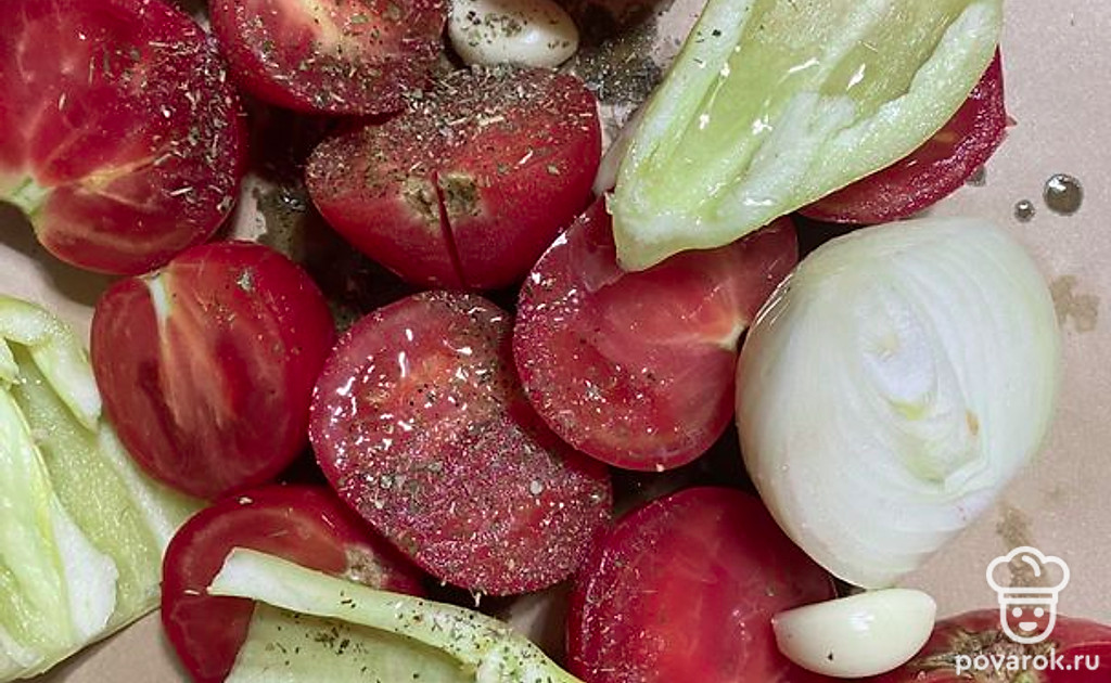 Разогрейте духовку до 180 градусов. Вымойте овощи. Помидоры нарежьте на несколько частей. На этом этапе можете срезать плодоножку. Я этого не делала, так как помидоры домашние. Перец очистите от семечек и разрежьте пополам. Я взяла меньше, так как не очень его люблю. Лук очистите и разрежьте на половинки. Чеснок очистите от шелухи.