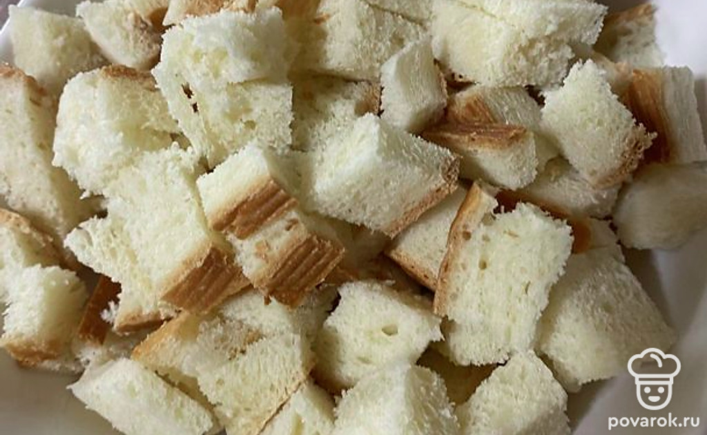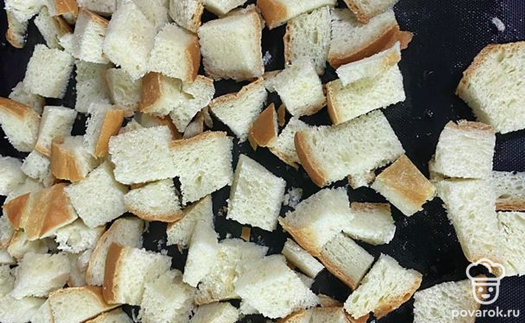 В это время нарежьте хлеб на кубики. Выложите на противень. Готовьте в духовке 10 минут при 180 градусах.