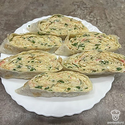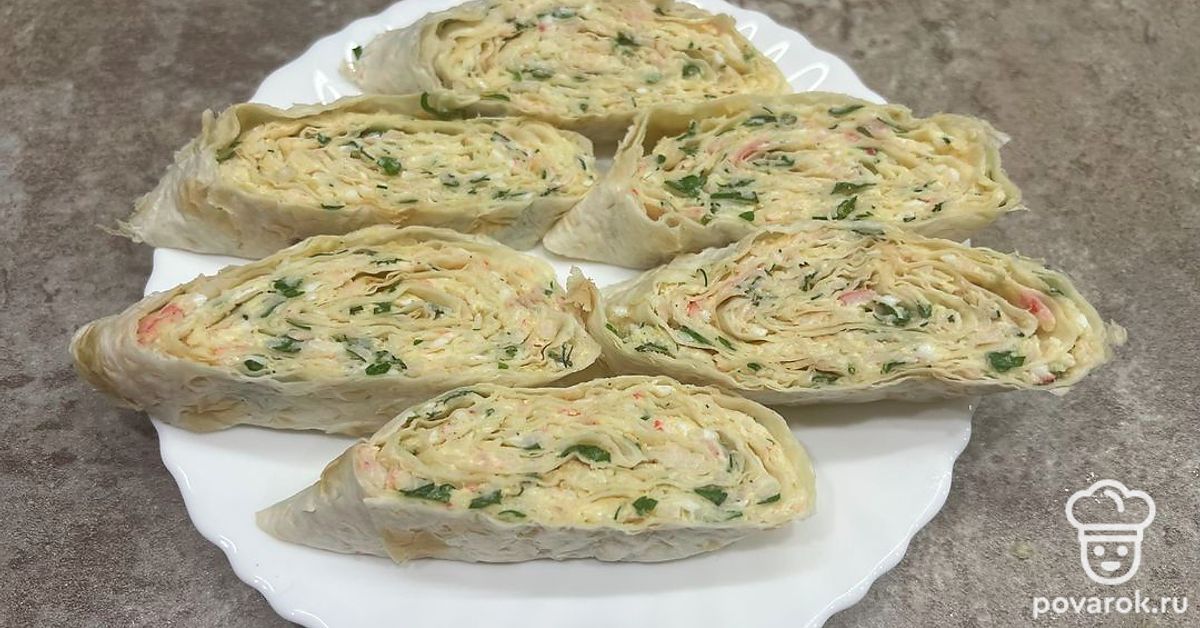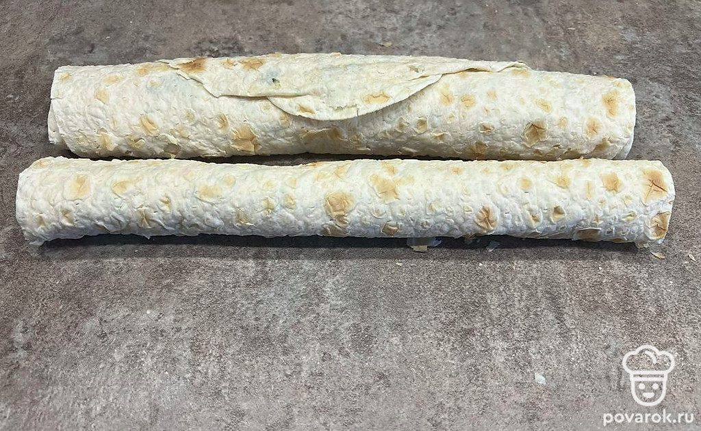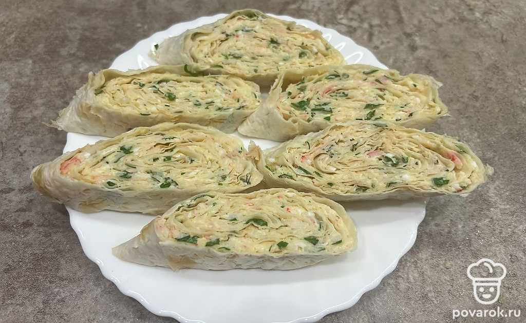 Готовые рулетики уберите в холодильник на 30 минут, чтобы они пропитались. Перед подачей рулетики нарежьте.