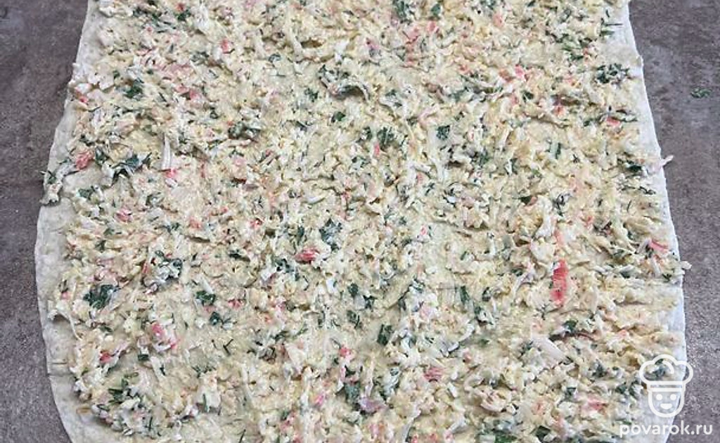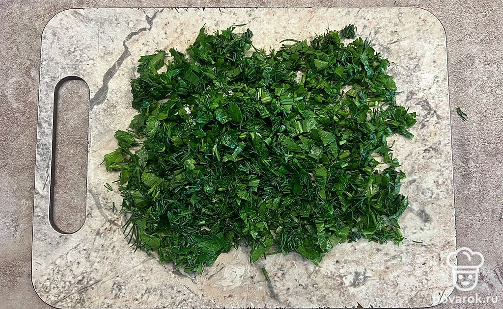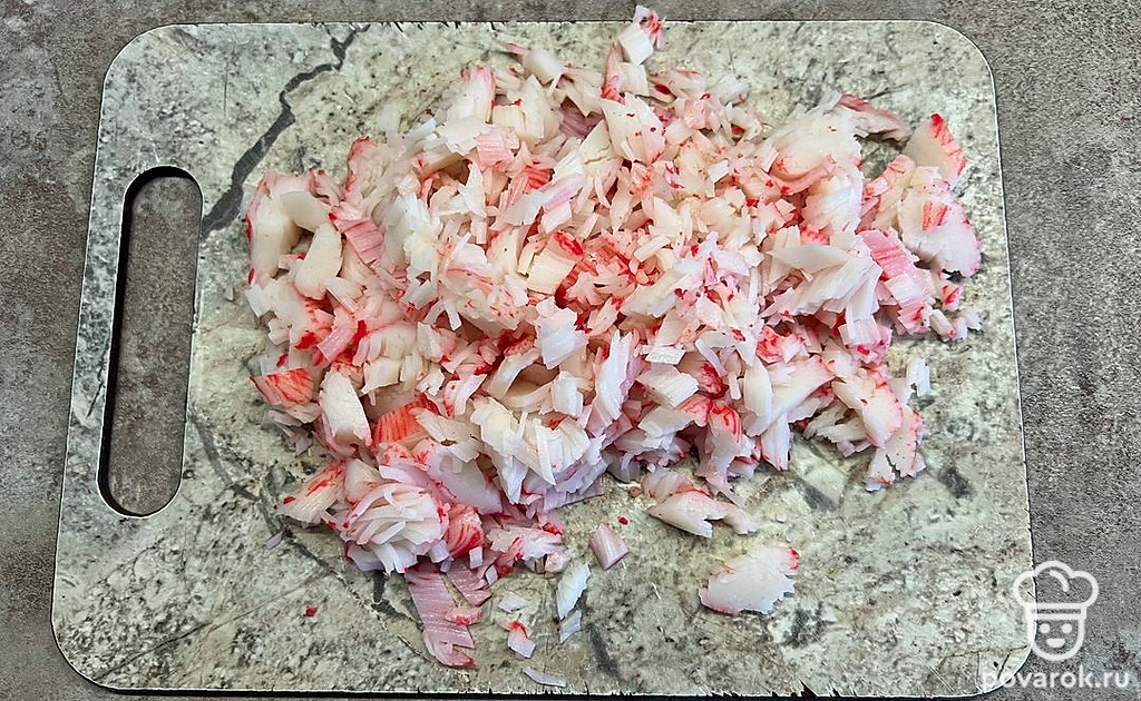 Мелко нашинкуйте зелень и добавьте к крабовым палочкам.