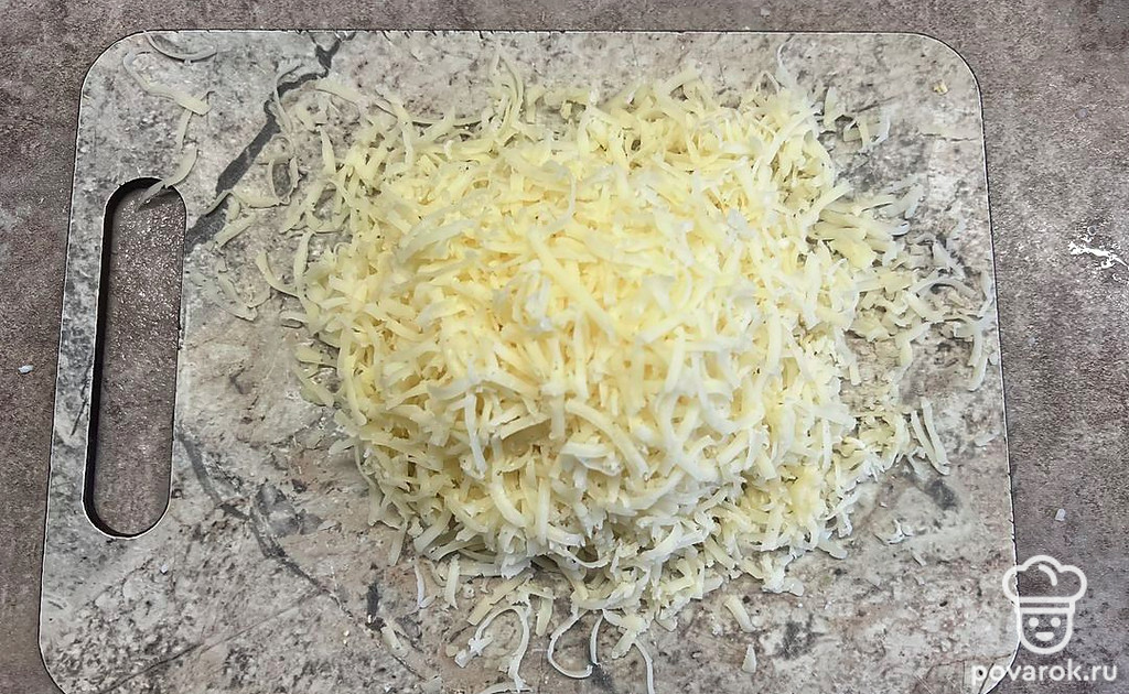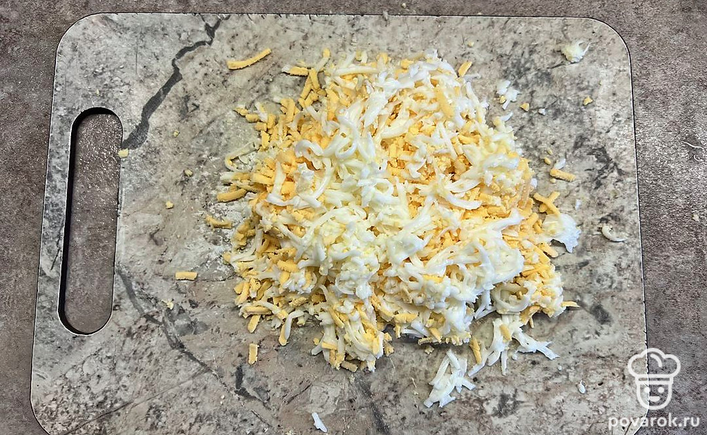 На мелкой терке натрите яйца и отправьте их к остальным ингредиентам.