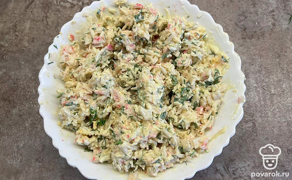 Заправьте нашу начинку майонезом, добавьте соль и перец. Хорошо перемешайте.