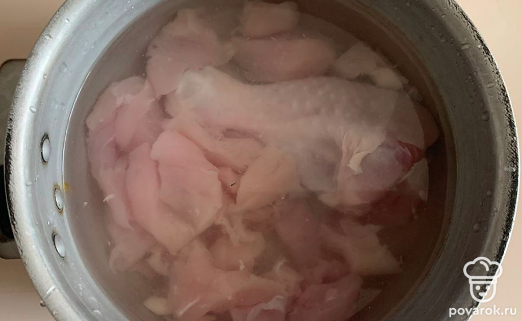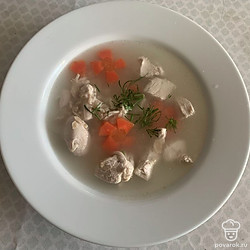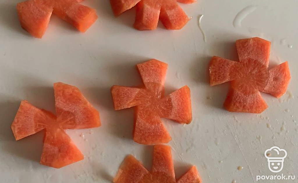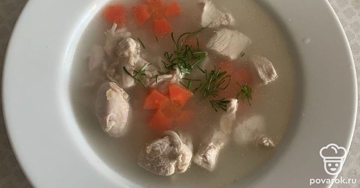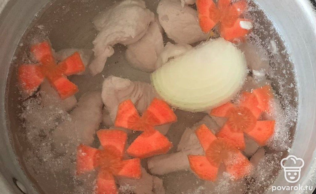 Добавить в бульон морковку и очищенный лук. Отварить до готовности морковки. Лук из бульона убрать.
