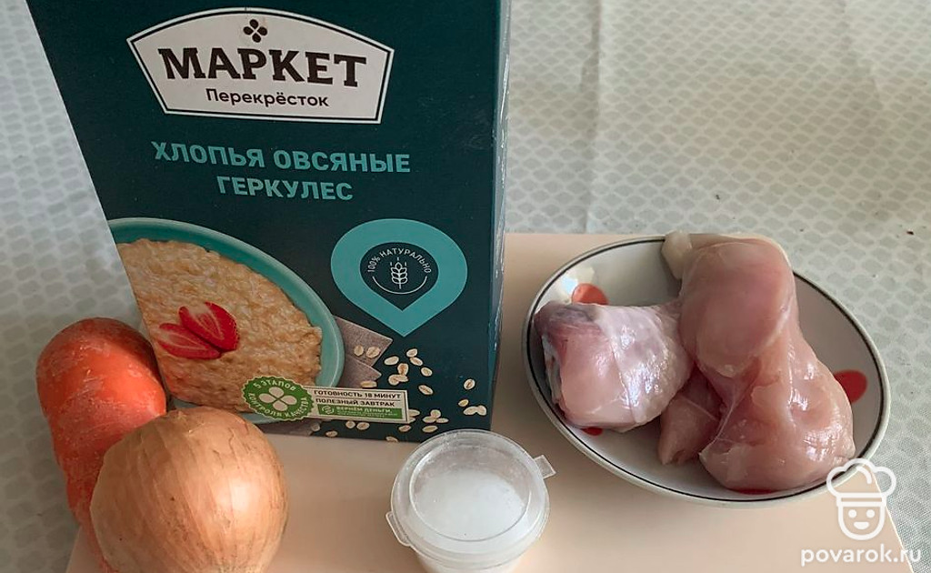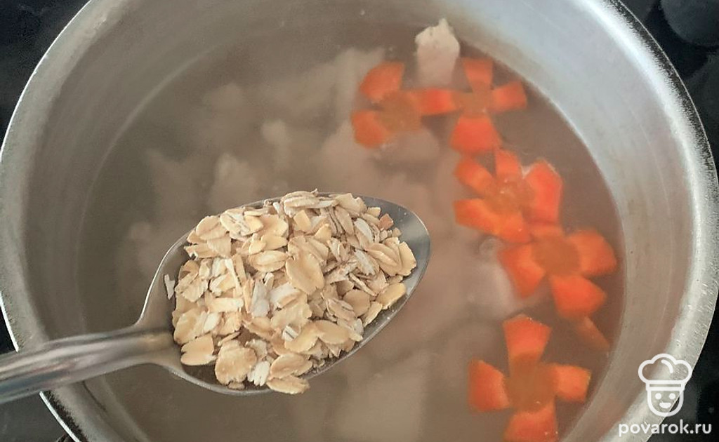Добавить овсяные хлопья, соль. Довести до готовности согласно инструкции. От голени отделить мясо, вернуть в бульон.
