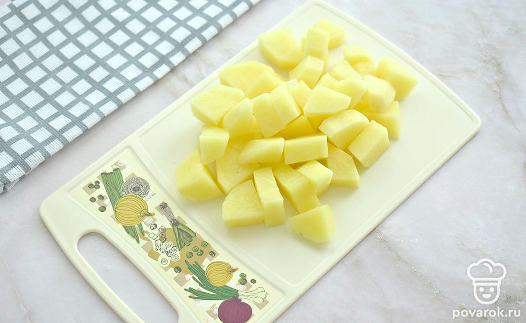 Почистите картошку, нарежьте кубиками, переложите в бульон.