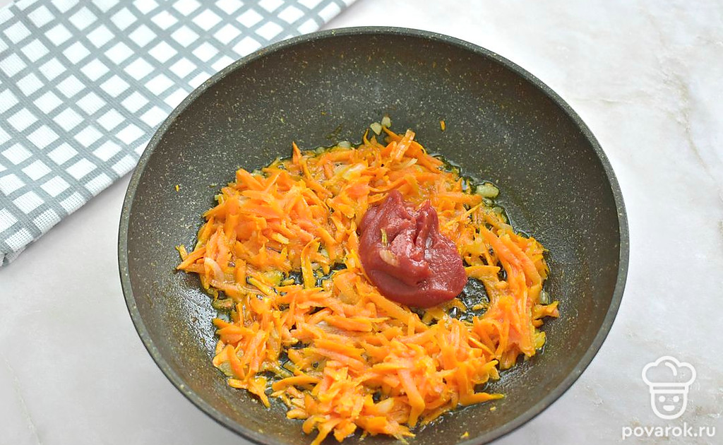 Нагрейте на сковороде растительное масло. Добавьте нарезанный репчатый лук, жарьте его 2 минуты. Затем добавьте тертую морковку, перемешайте. Продолжайте жарить 3 минут. К овощам добавьте томатную пасту, влейте 3 столовых ложки бульона из кастрюли. Тушите 3 минуты.