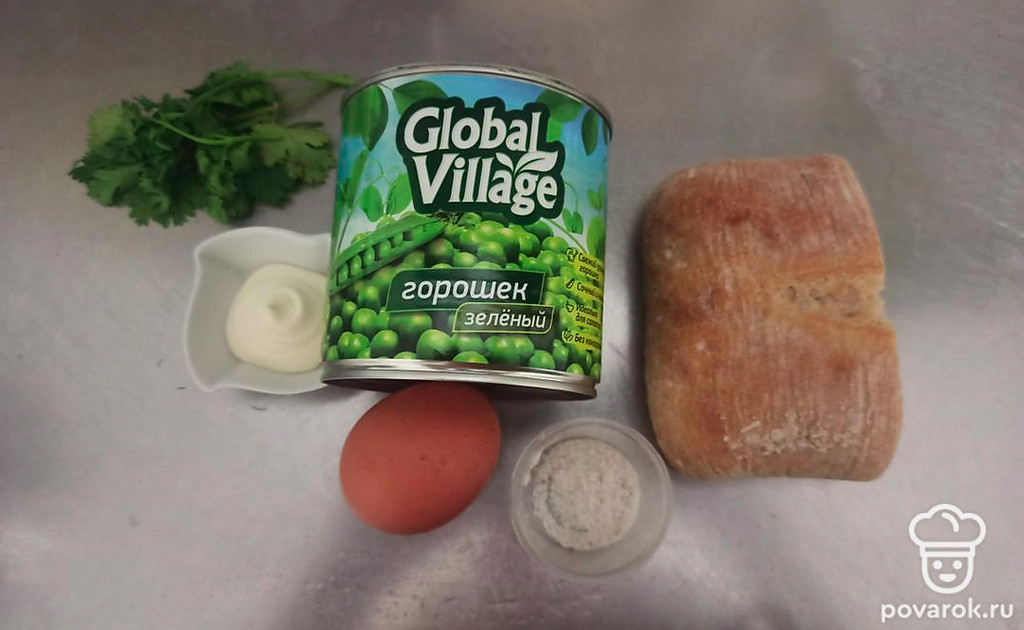 Выложите в соусник консервированный горошек. Добавьте майонез и кинзу, посолите. Помните горошек вилкой и перемешайте получившуюся массу.