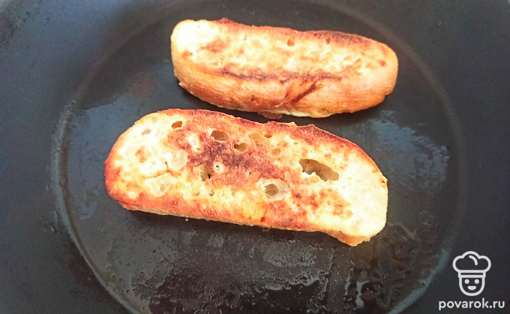 Обжарьте ломтики чиабатты на горячей сковороде с подсолнечным маслом с двух сторон до румяного цвета (5 минут).