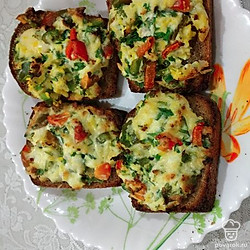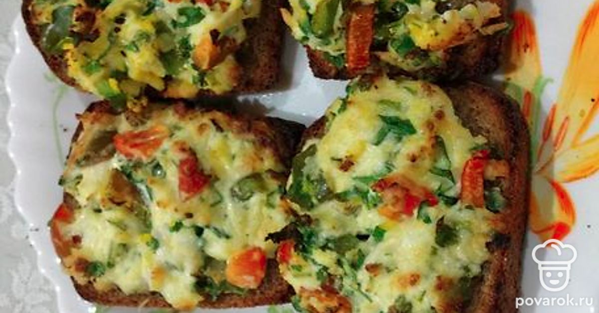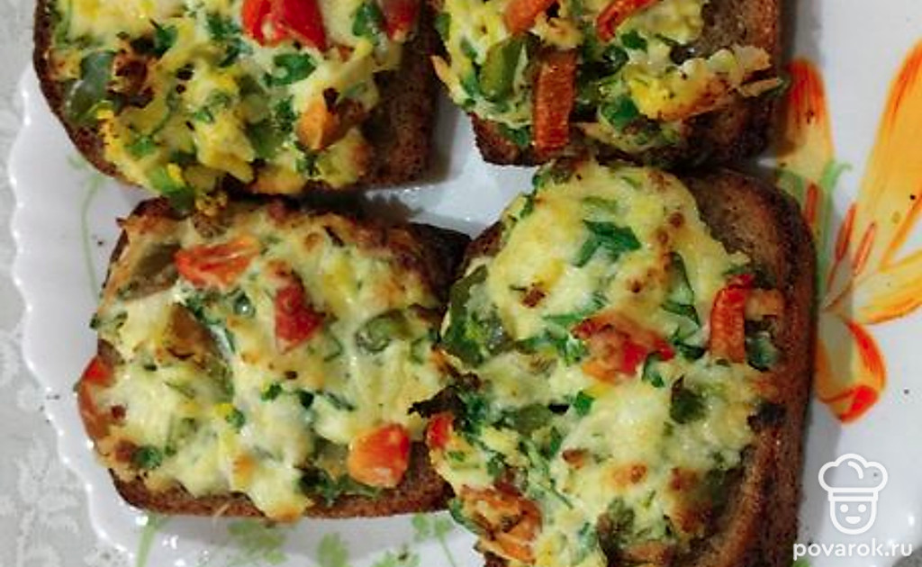Выложите начинку на кусочки хлеба. Отправьте в разогретую духовку на 10 минут при 150 градусах.
