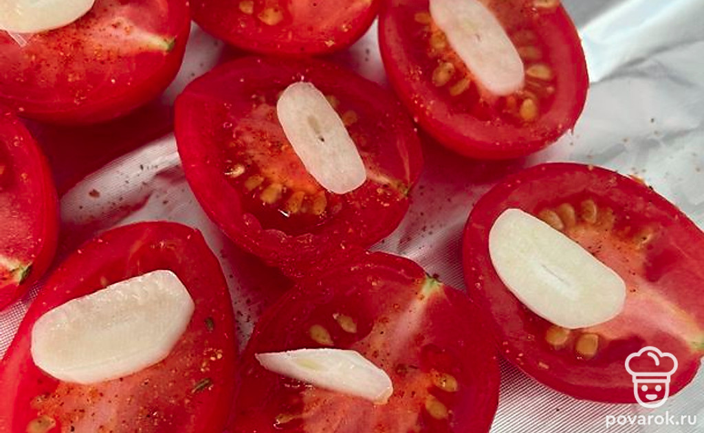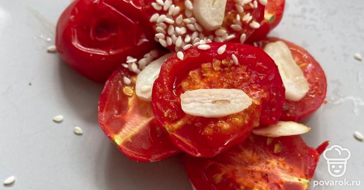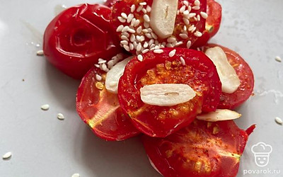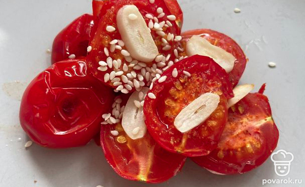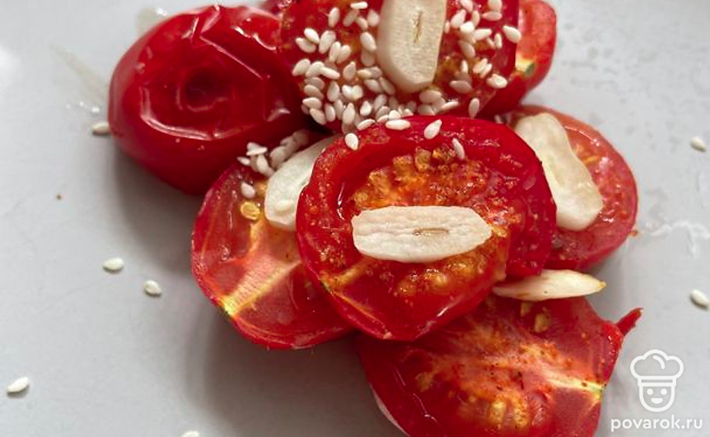 Печеные томаты с легкой кислинкой и душистым ароматом чеснока. Можно намазать на хлеб и подать в качестве самостоятельного блюда.