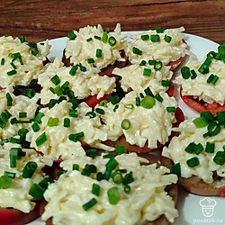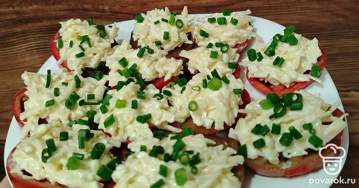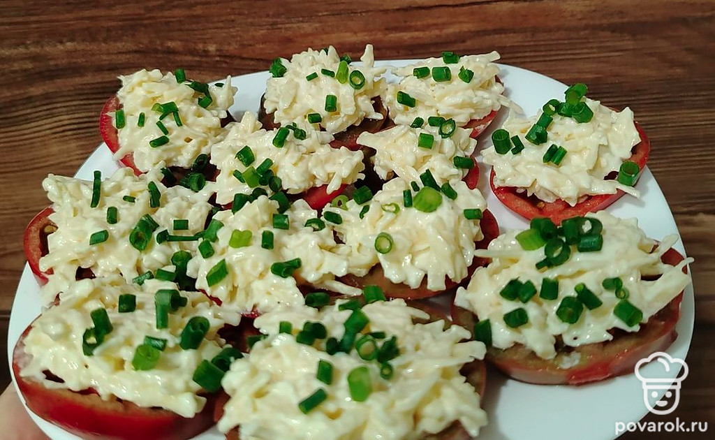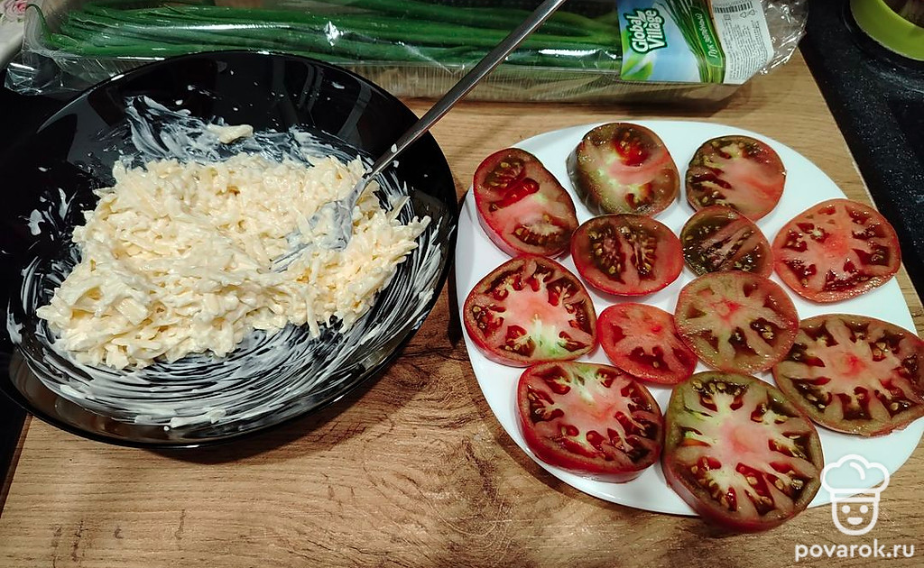 Нашинкуйте помидорки толстыми кольцами, сантиметра по 1,5. Выложите на них начинку.