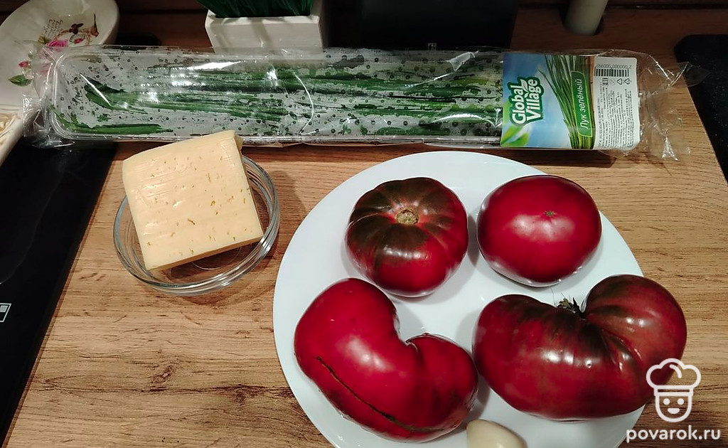 Подготовьте все ингредиенты. Я специально перевернула помидоры, чтобы вы смогли увидеть, что они реально черного цвета, пусть и не полностью. Также это видно будет при разрезе в следующих шагах.