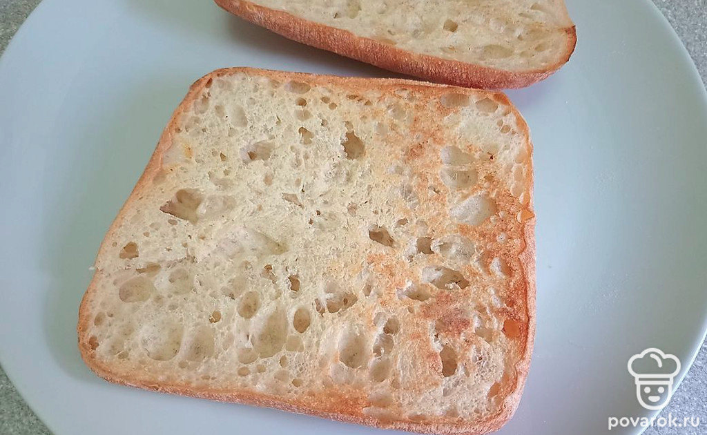 Булочку разрежьте вдоль на две части. Подсушите на сухой сковороде 1 минуту.