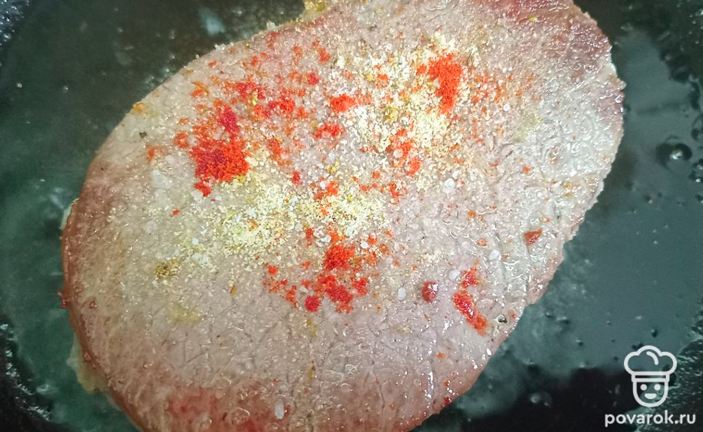 Обжарьте стейк по 3 минуты с каждой стороны. Посыпьте сушеным чесноком, красным перцем и солью.