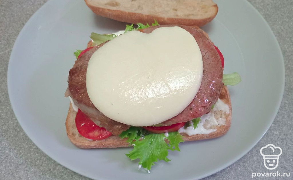 Выложите стейк на бургер. Сверху выложите моцареллу.